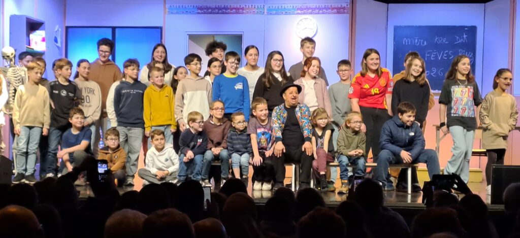 Pour sa deuxième venue au centre culturel, Booder a conquis une salle comble (500 spectateurs) par ses anecdotes, ses références à des attitudes, des objets que nous, élèves vieillissants mais à la mémoire intacte quand il s’agit de nous replonger dans notre enfance studieuse (ou pas), avons partagés. Et il sait de quoi il parte, notre « nounou », lui qui est papa d’un garçon de 15 ans. Duquel il parle avec tendresse ; une tendresse jamais démentie pour les enfants. Ceux du centre culturel, jeudi, ont eu la chance d’apprécier l’humanité, la gentillesse de Booder quand il les a tous fait monter sur la scène pour une photo qui restera gravée dans les esprits de toutes et tous.