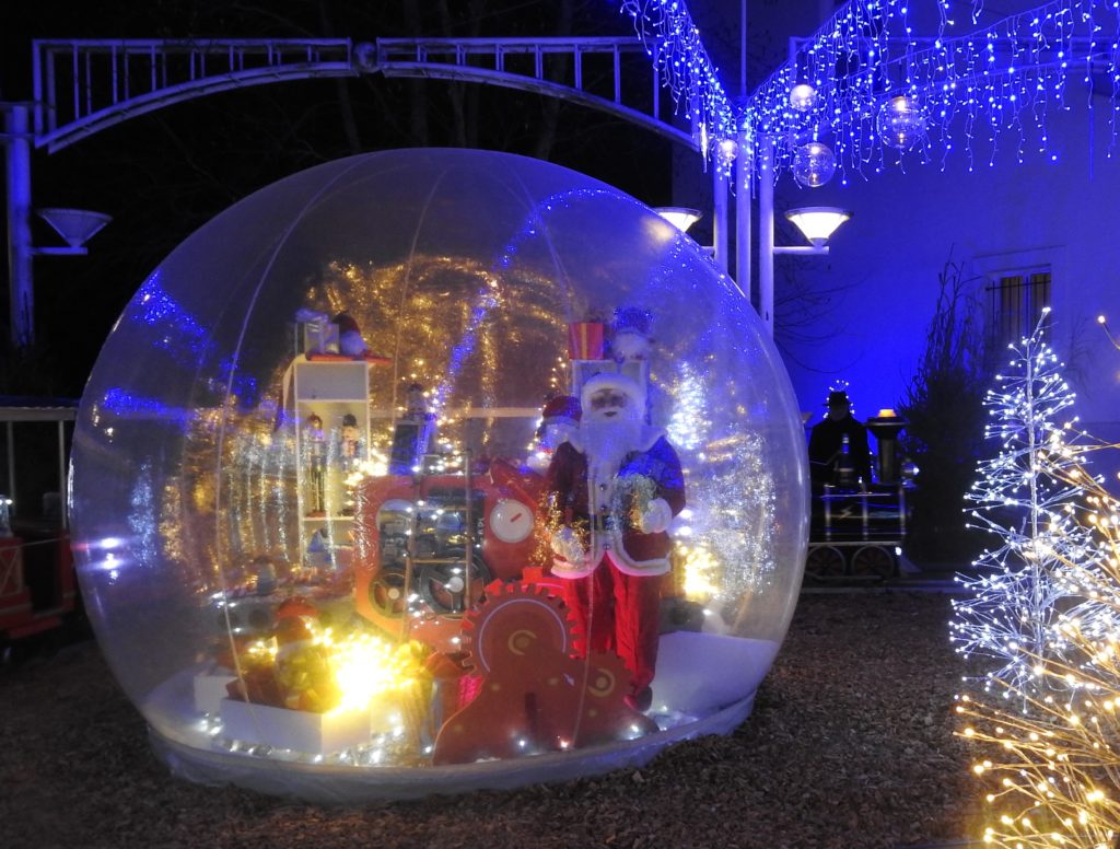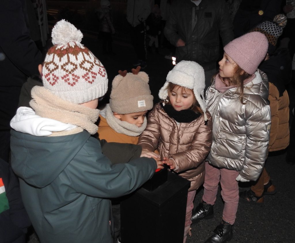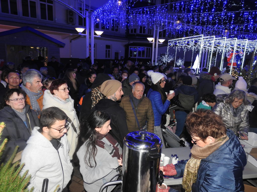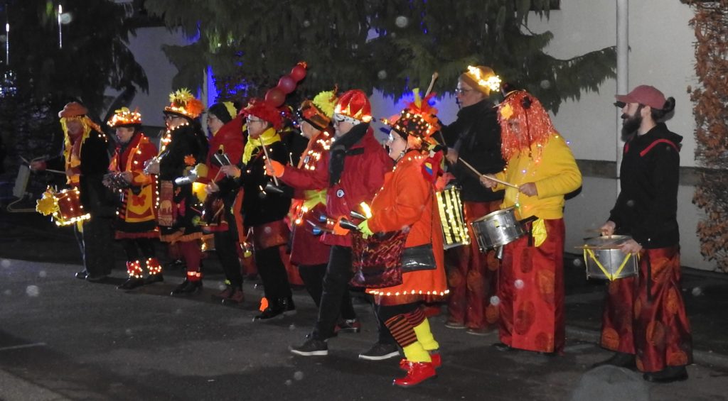 Un instant magique, donc, qui ne s’est pas arrêté au pied du sapin mais qui a rassemblé parents et enfants sur la place entre mairie et église, sublimée par des décors féeriques. Le chalet du père Noël (qu’il occupera parfois durant le marché de Noël), l’ourson géant, skis aux pieds, les bulles abritant des automates et surtout, surtout, le petit train qui, on s’en doute, fut pris d’assaut ! Et pendant que les enfants partaient en voyage, les parents patientaient en dégustant vin chaud, chocolat et brioche, offerts par la municipalité et servis par les élus. Le tout animé par la batucada (percussions brésiliennes) d’une quinzaine de musiciens de la troupe Oleocada qui réchauffèrent l’atmosphère..