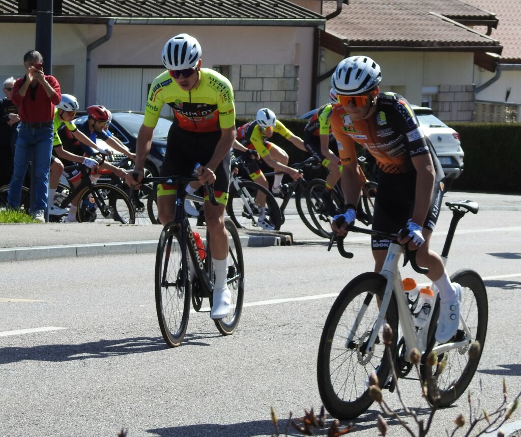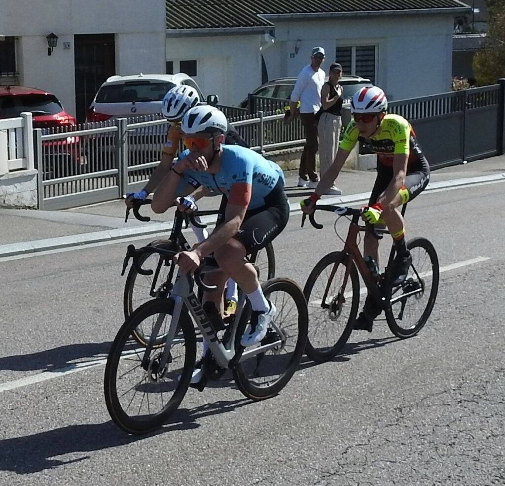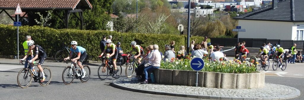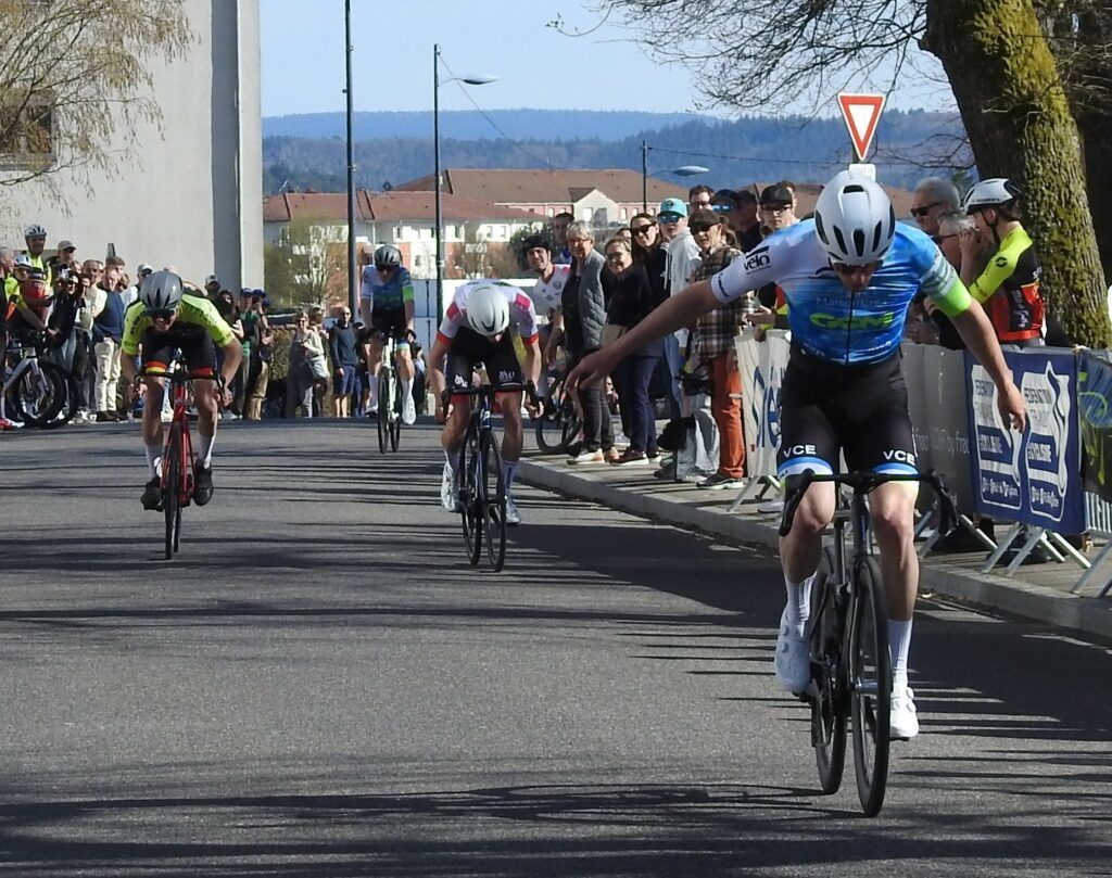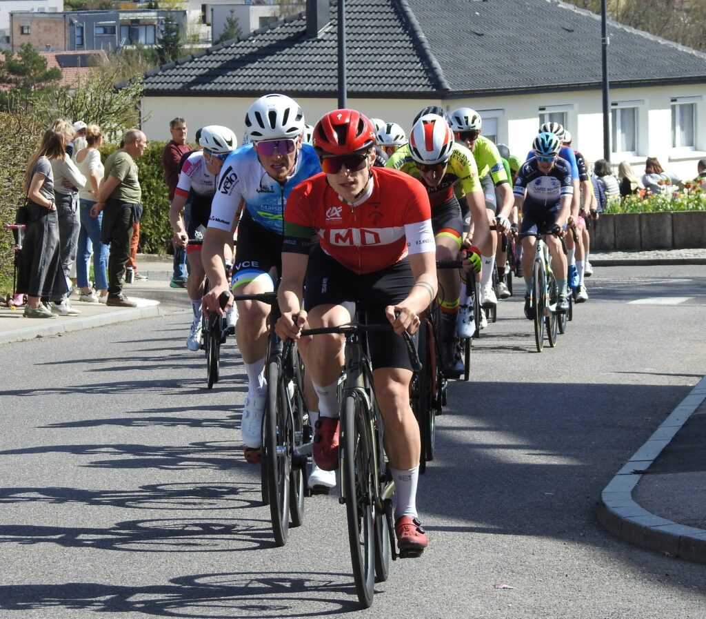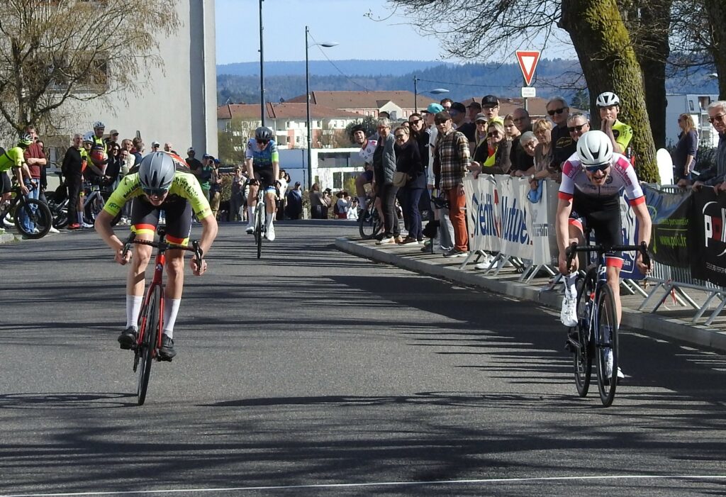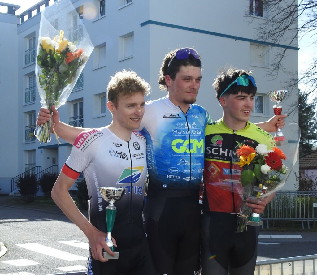 Comme toujours dans ce genre d’épreuve, les attaques furent légion mais à un peu plus de la mi-course, trois garçons parvenaient à prendre la tangente : le Golbéen Camille Aubert, Théo Guignier (Wittenheim) et Robin Buridon (Eckwersheim). Derrière, la chasse ne s’organisait pas et le trio de fuyards compta bientôt 40 secondes d’avance. On pensait tenir le futur vainqueur parmi ces trois-là mais à 5 tours de la fin, Baptiste Bachelet (Eckwersheim) parvenait à s’extirper du peloton. Faisant le forcing, alors qu’un de ses équipiers (Buridon) était devant et faisait en sorte de l’attendre, Bachelet parvenaiit à faire la jonction et, dans un sprint rageur, franchissait la ligne d’arrivée en vainqueur, devançant Théo Guignier et Camille Aubert qui offrait un beau podium au Cycle Golbéen.