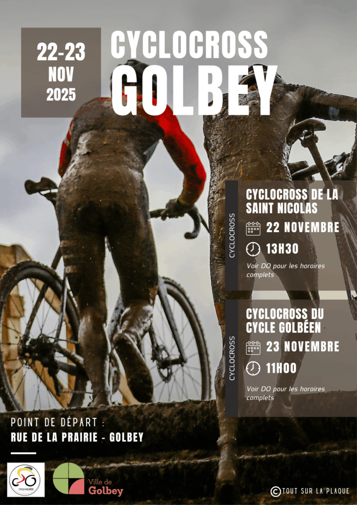Comme chaque année à pareille époque, Claude Thomas et son équipe du Cycle Golbéen organisent deux cyclo-cross du côté des rues de la Prairie et Jules-Ferry. Deux épreuves au programme : le cyclo-cross de la Saint-Nicolas et celui du Cycle Golbéen. Le tout sur un circuit mêlant bitume, prés et sous-bois. Des épreuves toujours spectaculaires qui avaient vu, l’an passé, dans les épreuves phares, les victoires d’Hervé Ridart (Vallée de la Vologne) le samedi et de Laurys Laurent (3 Frontières VTT) le dimanche. Leur succession est ouverte !